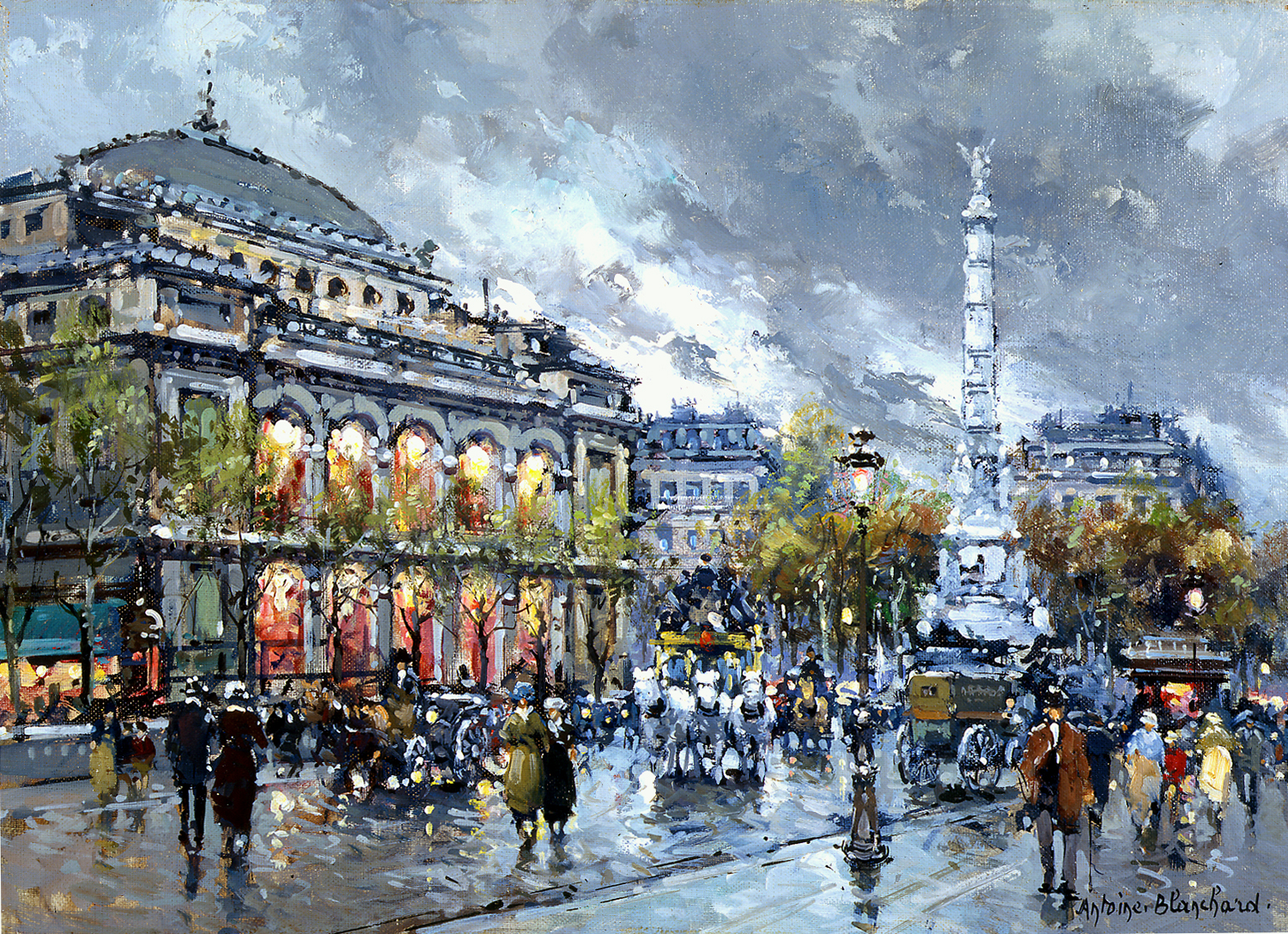 oil painting of the boulevard de la madeleine in paris with horses, carts and people walking in the street